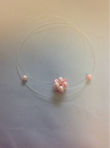 Materials: 100 4mm glass pearls, fishing line, beading wire, clasp, 2 crimp beads, scissors, and crimping pliers.